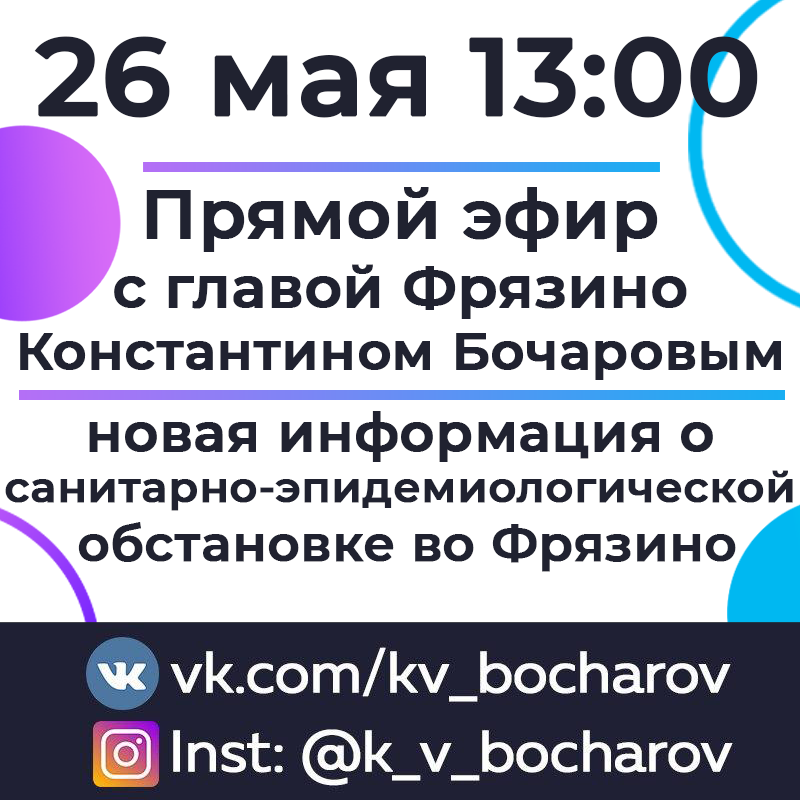 Во вторник, 26 мая в 13:00 состоится очередной прямой эфир с главой г.о. Фрязино Константином Бочаровым