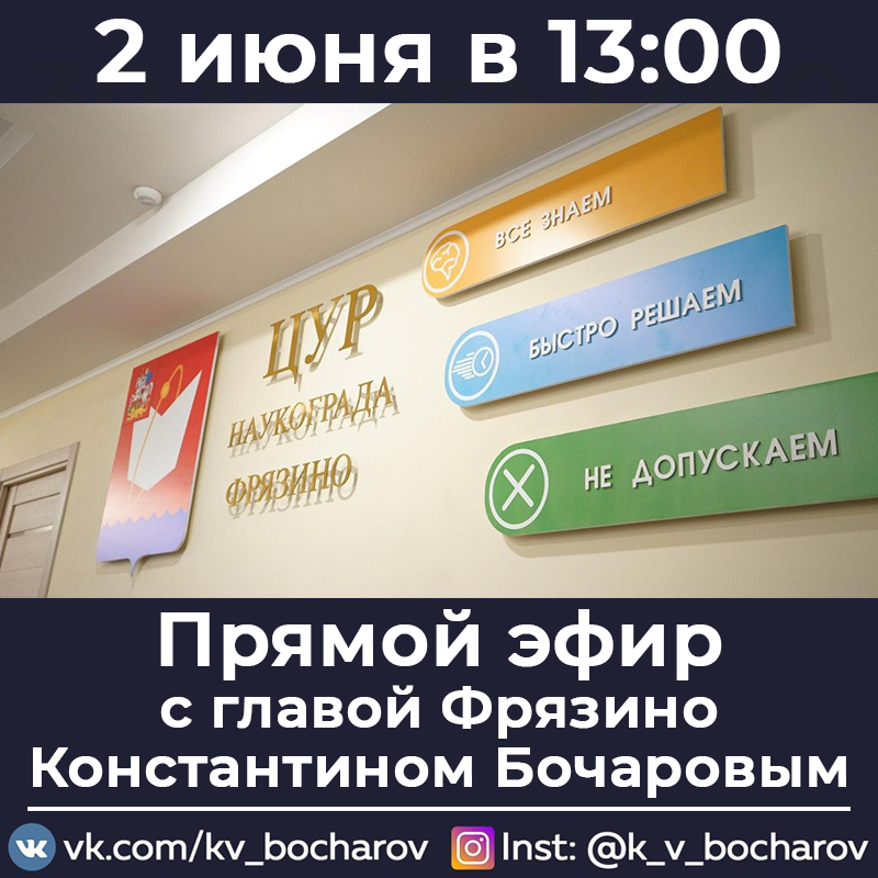2 июня в 13:00 состоится очередной прямой эфир с главой г.о. Фрязино Константином Бочаровым