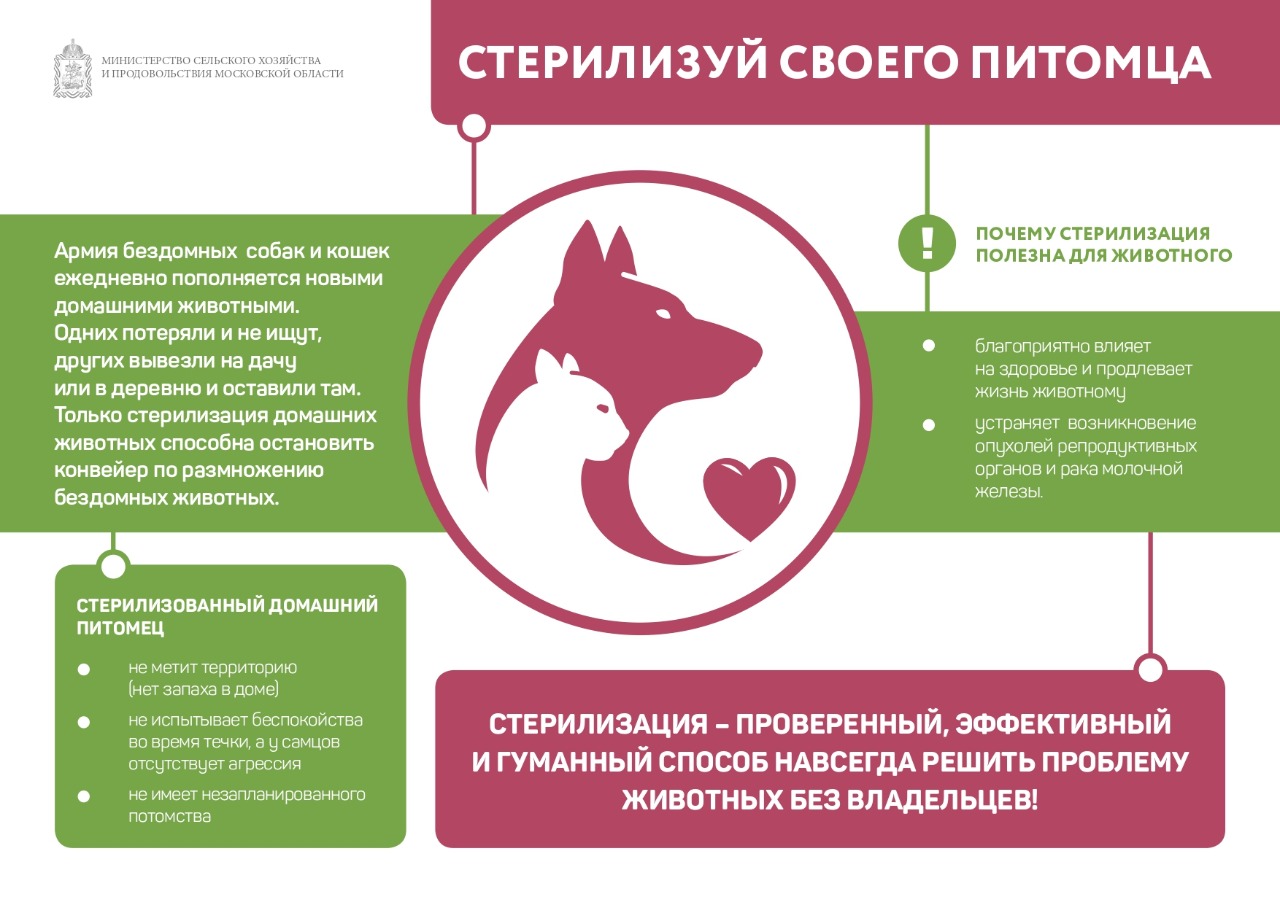 Министерство сельского хозяйства и продовольствия МО информирует о необходимости стерилизации домашних животныхСтерилизация является одним из наиболее гуманных способов контроля популяции домашних питомцев. Ветеринары рекомендуют проводить процедуру всем питомцам, которых не планируется использовать в племенном разведении.