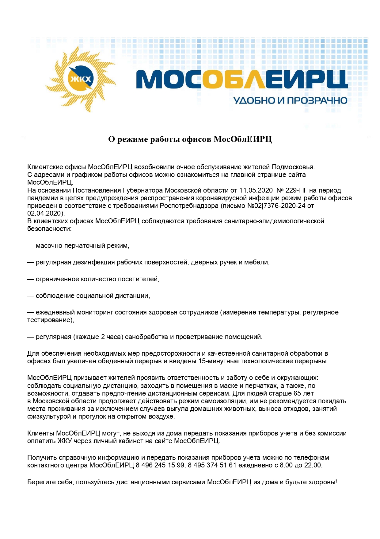 ››› В Московской области 74 центральных офиса МосОблЕИРЦ возобновляют свою работу и начинают очное обслуживание граждан