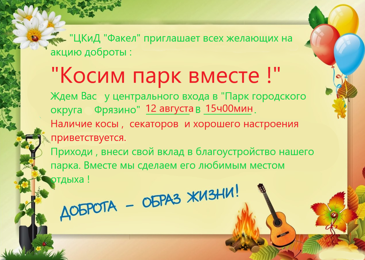 Акция доброты «Косим парк вместе!»В следующую среду, 12 августа в 15:00 силами сотрудников культуры и Управления ЖКХ пройдет акция, цель которой вместе облагородить парк. Все, кто хочет помочь - очень ждём. Наличие косы, секаторов, перчаток приветствуется. Внеси свой вклад в благоустройство. |