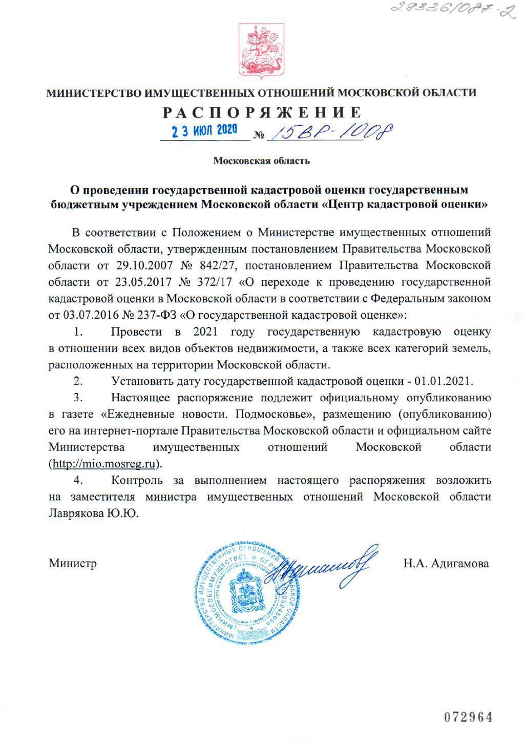 ››› Распоряжение Министерства имущественных отношений Московской области от 23.07.2020 № 15ВР-1008 «О проведении государственной кадастровой оценки государственным бюджетным учреждением Московской области «Центр кадастровой оценки»