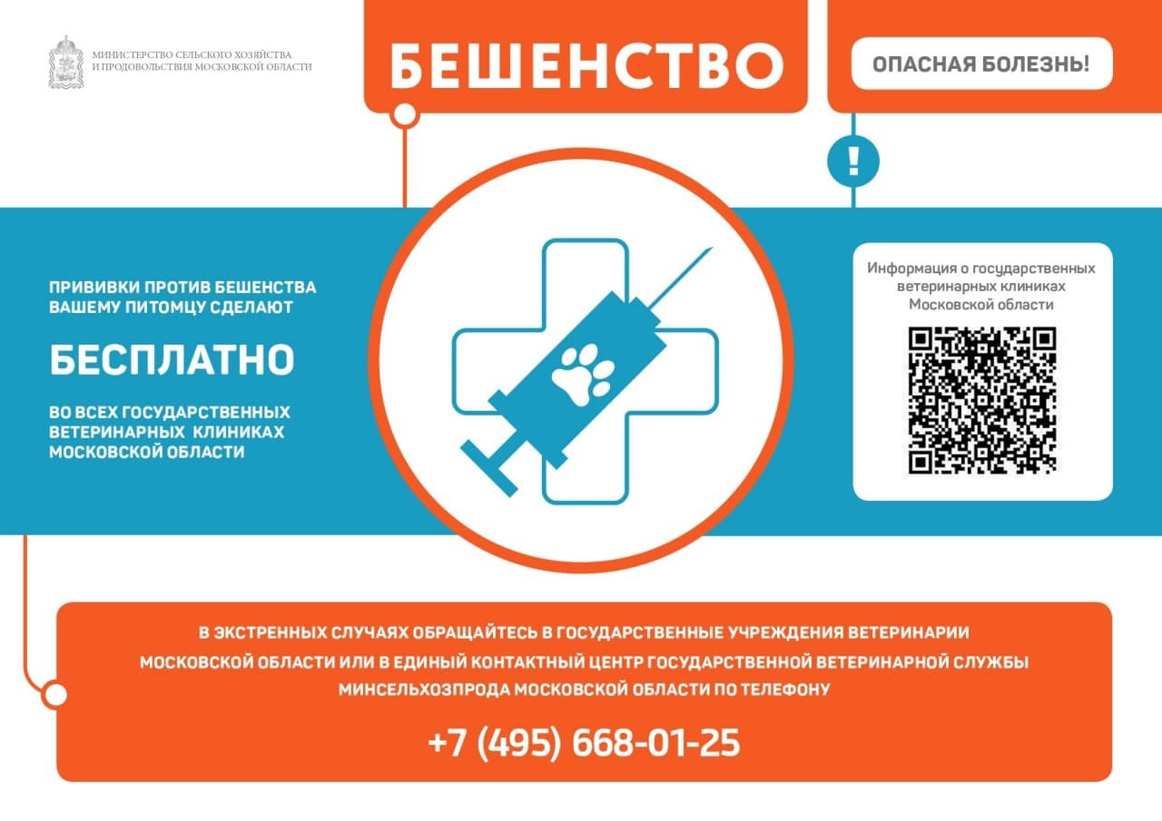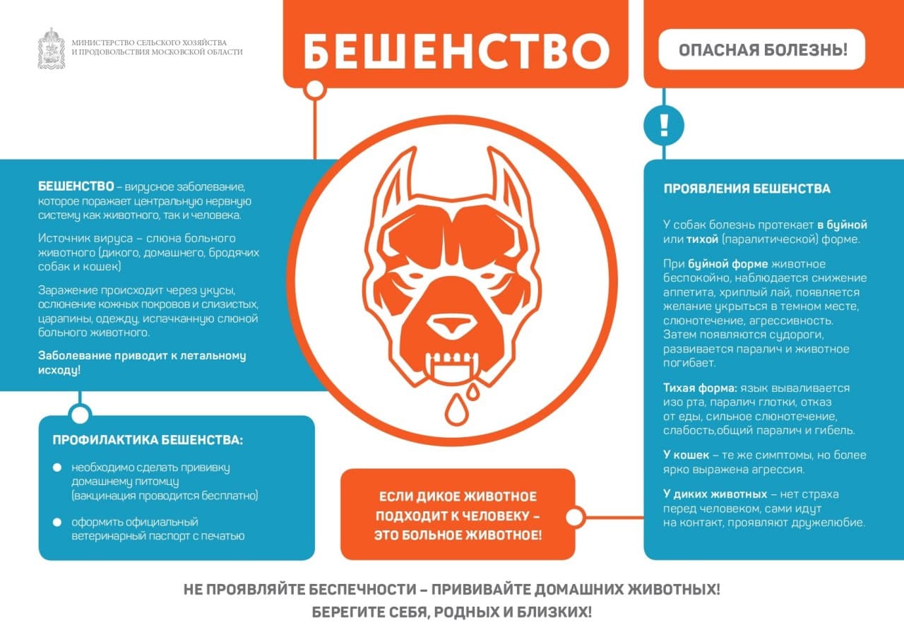 В ветклиниках Московской области делают прививки против бешенства бесплатноБешенство – болезнь животных и человека, вызываемая вирусом и представляющая смертельную опасность. Заражение человека и животных происходит при непосредственном контакте с источниками возбудителя бешенства в результате укуса или ослюнения поврежденных кожных покровов или наружных слизистых оболочек. Бесплатно сделать своим домашним животным вакцинацию от бешенства можно в ветеринарных станциях либо ветеринарных лечебницах Московской области https://msh.mosreg.ru/dokumenty/informaciya/21-04-2020-14-03-11-informatsiya-o-veterinarnykh-stantsiyakh-veterinar Будьте осторожны при встрече с бездомными и дикими животными, своевременно проводите профилактическую вакцинацию домашних питомцев. |