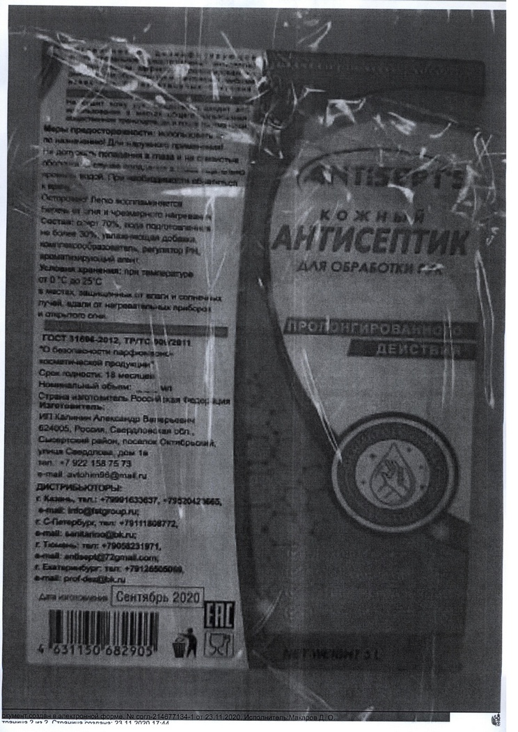 Федеральная служба по надзору в сфере защиты прав потребителей и благополучия человека в связи с регистрацией случаев отравлений от употребления внутрь кожного антисептика для обработки рук «Antisept’s» (копия маркировки прилагается) производства ИП «Калинин Александр Валерьевич» (624005, Свердловская обл., Сысертский р-н, пос. Октябрьский, ул. Свердлова, д. 1 В), по результатам лабораторных исследований которого установлено содержание метанола от 62% до 69%, сообщает о необходимости: - при выявлении указанной продукции на потребительском рынке направлять информацию о хозяйствующем субъекте, осуществляющем реализацию данного продукта в Щелковский территориальный отдел Управления Роспотребнадзора по Московской области по телефону 8 (496) 566-43-11.