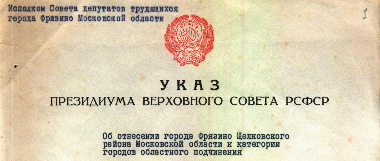 17 апреля 1968 года Президиумом Верховного Совета РСФСР был подписан Указ “Об отнесении города Фрязино Щелковского района Московской области к категории городов областного подчинения”. С этой даты Фрязино стал называться: город Фрязино Московской области, а городской Совет — Фрязинский городской Совет депутатов трудящихся Московской области. На хранящемся в Государственном Архиве РФ экземпляре Указа отмечено, что Указ оглашен инструктором Мособлисполкома т. Шеваневым на сессии Фрязинского горсовета 31 июля 1968 года. На этом же заседании горсовета председателем исполкома был избран Корнев Василий Сергеевич, занимавший этот пост с 17 марта 1967 года. Заместителями председателя стали Белинская Марианна Борисовна и Черкашин Борис Ильич, секретарем - Манзюкова Клавдия Петровна. Члены исполкома: Амосов Константин Алексеевич, Волошин Рувим Исаакович, Ильин Григорий Александрович, Колмогоров Григорий Дмитриевич, Панас Иван Михайлович, Пахомов Евгений Иванович, Ситникова Вера Дмитриевна, Саушкин Александр Владимирович, Струков Владимир Сергеевич. Штатное расписания исполкома Фрязинского городского Совета депутатов трудящихся Московской области было утверждено на заседании исполкома 31 июля 1968 года. В структуру исполкома вошли: Плановая комиссия, Отдел народного образования, Отдел культуры, Управление коммунального хозяйства, Отдел главного архитектора, Бюро ЗАГС, Отдел социального обеспечения, Общий отдел, Штаб гражданской обороны, Военно-учетный стол. В 1968 году Фрязинская городская больница, преобразована во Фрязинскую центральную городскую больницу с непосредственным подчинение отделу здравоохранения Мособлисполкома. Приказом Московского областного финансового отдела от 13 августа 1968 года создается Фрязинский городской финансовый отдел. 10 октября 1968 года приказом по Аптекоуправлению Мооблисполкома аптека № 21 учреждена центральной городской аптекой. Была создана самостоятельная инфраструктура города. До этого все городские службы подчинялись исполкому Шёлковского городского Совета народных депутатов Московской области, а решения Фрязинского исполкома подтверждались решениями Щёлковского исполкома. |