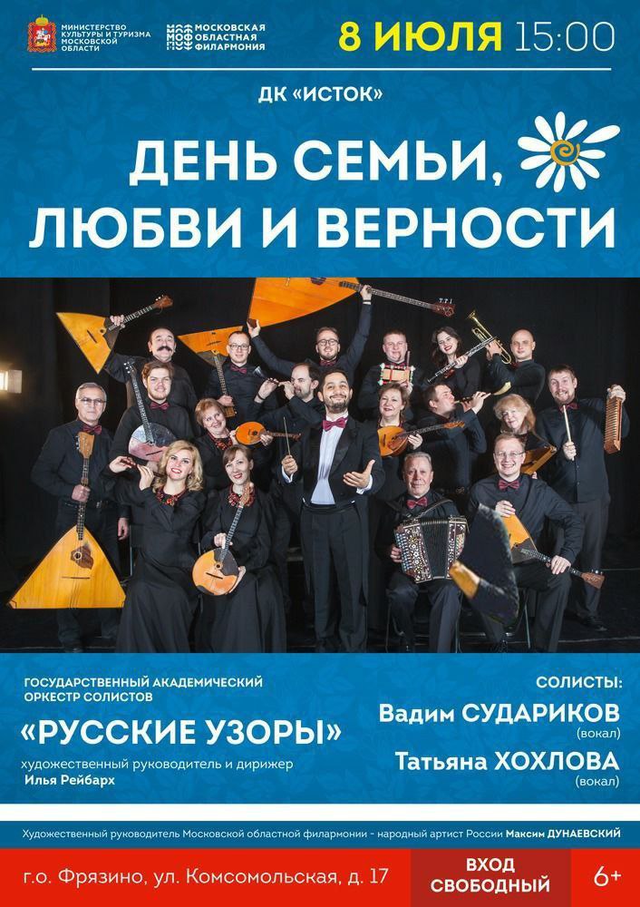 Уважаемые жители Наукограда! 8 июля 2022 года приглашаем Вас на концерт Государственного Академического оркестра солистов «Русские узоры»!Уважаемые жители Наукограда! 8 июля 2022 года, в День любви, семьи и верности, приглашаем Вас в ДК «Исток» на концерт Государственного Академического оркестра солистов «Русские узоры»! Начало в 15.00. Вход свободный. |