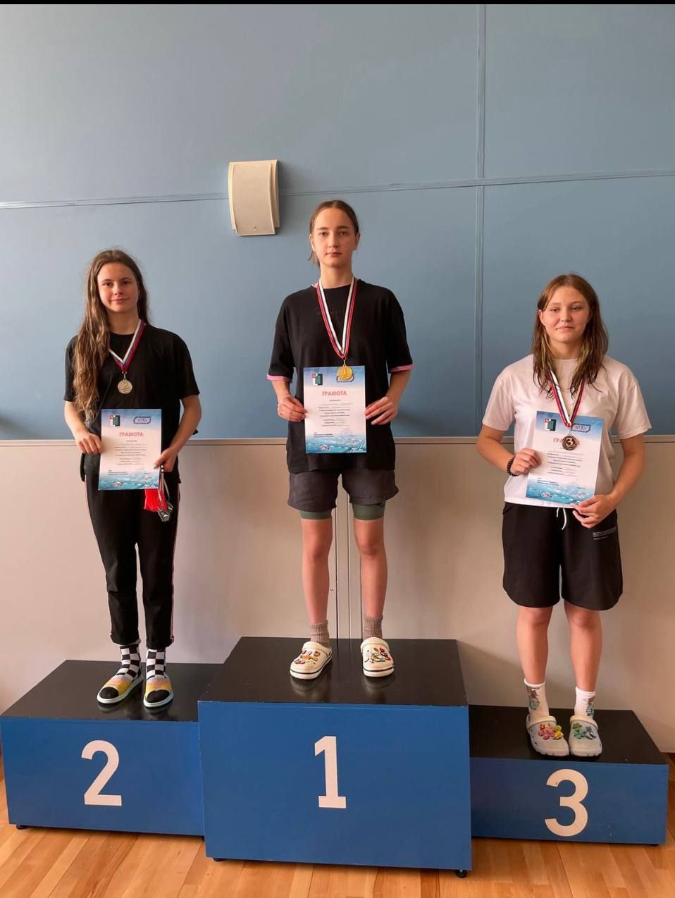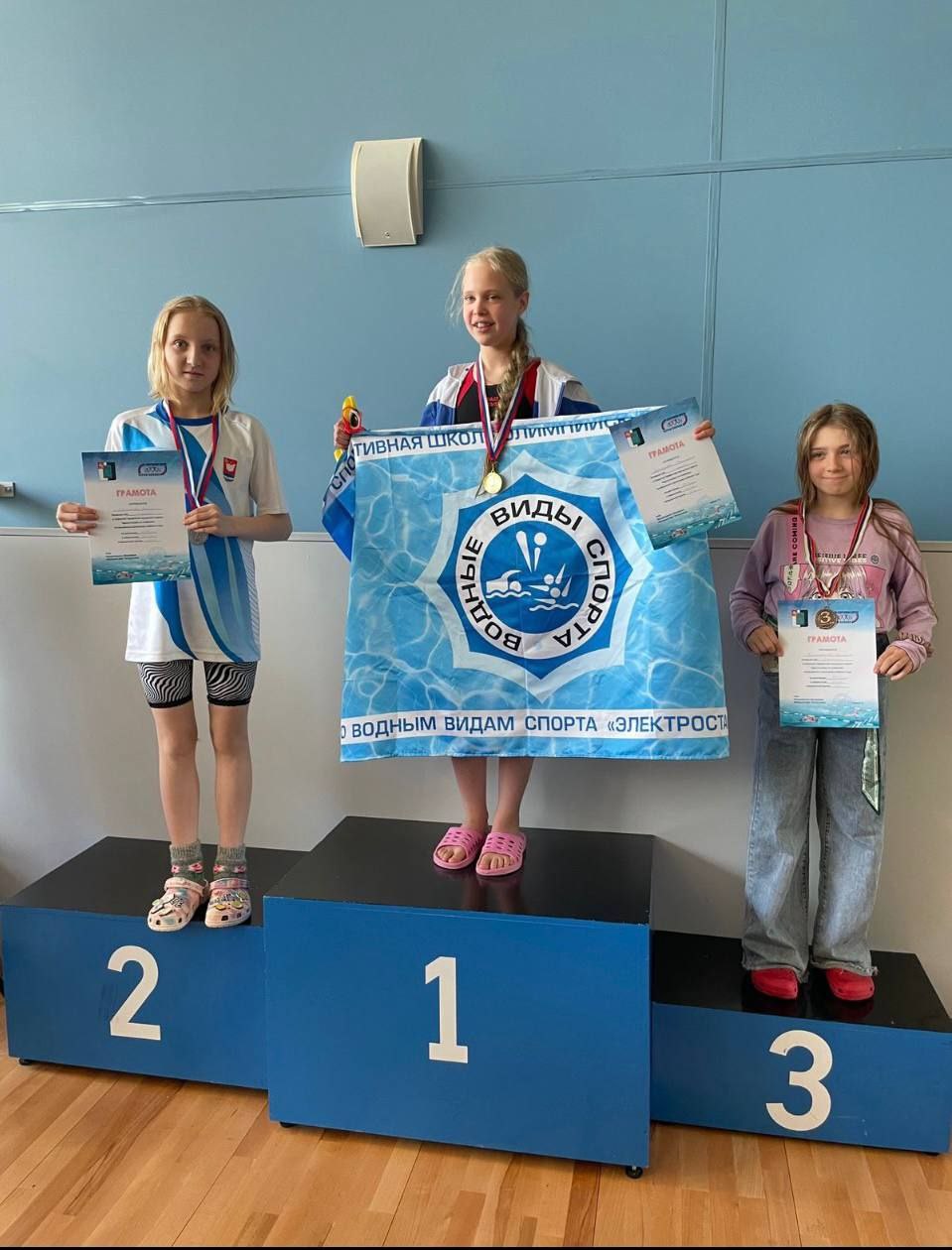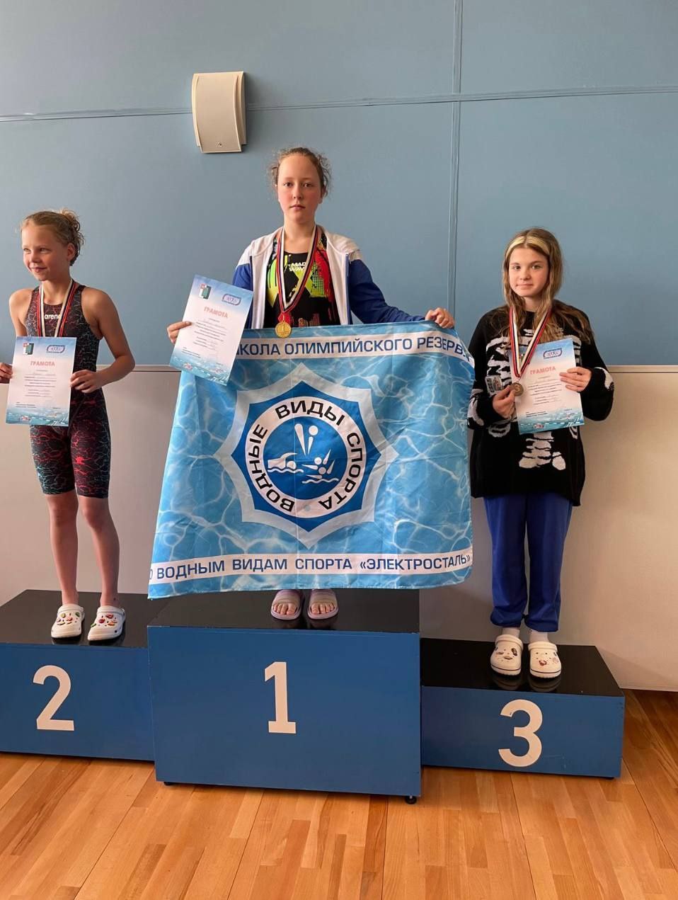 Фрязинские пловцы завоевали 43 медалиВ Черноголовке прошло открытое Первенство по плаванию, в котором приняли участие 20 команд городов Подмосковья. Команду фрязинской спортивной школы «Олимп» представляли 37 спортсменов! В медальном зачете наша команда заняла 1 место, завоевав 43 медали. 23 золотых, 14 серебряных, 9 бронзовых. · Бурлаченко Настя – 2 золотых медали · Шаймарданов Даниил – 2 золотых медали · Павлючко Максим – 2 золотых медали · Зайцев Костя – 2 золотых медали · Надобников Артем – 1 золотая медаль · Воробьев Даниил – 1 золотая медаль · Клинаев Матвей – 1 золотая медаль · Пронин Павел – 1 золотая медаль · Кручинина Арина – 1 золотая, 1 серебряная медаль · Орловская Валя – 1 золотая, 1 серебряная медаль · Захаров Семен – 1 золотая, 1 серебряная медаль · Козлов Кирилл – 1 золотая, 1 серебряная медаль · Ломовская Софья – 1 золотая, 1 серебряная медаль · Фокина Виктория – 1 золотая, 1 серебряная медаль · Беззубова Софья – 1 золотая, 1 серебряная медаль · Захаров Дима – 1 золотая, 1 бронзовая медаль · Кобзев Илья – 2 серебряных медали · Адареев Никита – 1 серебряная медаль · Митасова Лера – 1 серебряная медаль · Поддубный Иван – 1 серебряная медаль · Белобровкин Леонид – 1 серебряная медаль · Поддубный Женя – 1 серебряная, 1 бронзовая медаль · Потиенок Герман – 1 бронзовая медаль · Птичникова Настя – 2 бронзовых медали · Беляева Дарья – 2 бронзовых медали · Борисова Варя – 1 бронзовая медаль · Фридлянд Марк – 1 бронзовая медаль Поздравляем спортсменов, тренеров. Желаем новых высоких результатов и блестящих побед!!! |