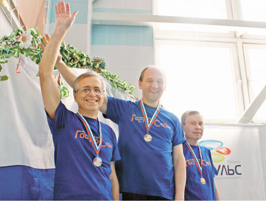 Как предприятие дошло «до жизни такой»? Как в любом деле, все решают энтузиасты. И в «Исток-Системе» тоже, казалось бы, неожиданно у ведущего инженера Ольги Алексеевны Ананич появился спортивно-организаторский талант. Как только открылся бассейн, она «по поручению трудового коллектива» поинтересовалась у директора (у меня), а нельзя ли как-то решить вопрос с коллективным плаваньем? Получив «добро» от заместителя главы администрации Алексея Анатольевича Курова, мы выкупили какое-то количество абонементов для сотрудников и с тех пор покупаем их каждый месяц. Но самым главным фактором, конечно, оказался энтузиазм нашей Ольги Алексеевны. Она вдруг оказалась тренером по плаванью, занималась со всеми «плавающими» сотрудниками, отдельно с детьми сотрудников. А уж когда появилась идея соревнований коллективов, тут она уже проходу не давала никому, начала усиленно тренировать команду к соревнованиям, одних уговаривала лаской, других деликатно вытаскивала к директору, организовала футболки «Гастроскан» и многое-многое другое. Как хорошо, когда в коллективе есть такой человек! С радостью поздравляю всю нашу команду, а особенно тех, кто в своих возрастных категориях занял первые места. Это Ольга Алексеевна Ананич (она на фотографии), Леонид Евгеньевич Мишулин – заместитель генерального директора, заслуженный конструктор РФ, лауреат Премии Правительства РФ в области науки и техники, кандидат технических наук (он тоже на фотографии на пьедестале почета), а также наша женская эстафетная команда. Второе место среди «самых опытных пловцов» занял другой мой заместитель – заслуженный машиностроитель, доктор экономических наук Борис Васильевич Ракитин, третье – тоже член команды «Гастроскан» – Владимир Борисович Горелов.