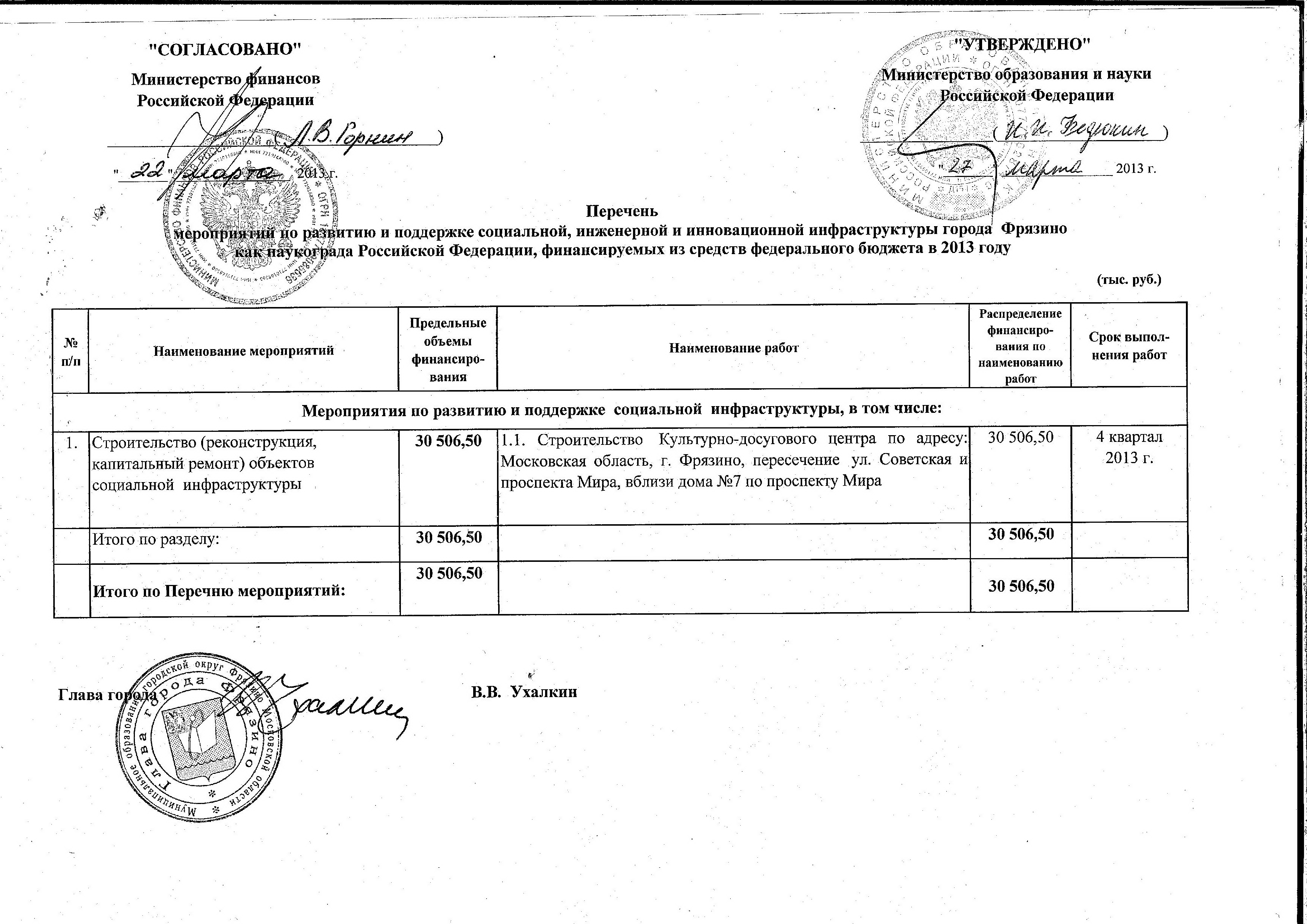 Перечень мероприятий по развитию и поддержке социальной, инженерной и инновационной инфраструктуры города Фрязино как наукограда Российской Федерации, финансируемых из средств федерального бюджета на 2013 год