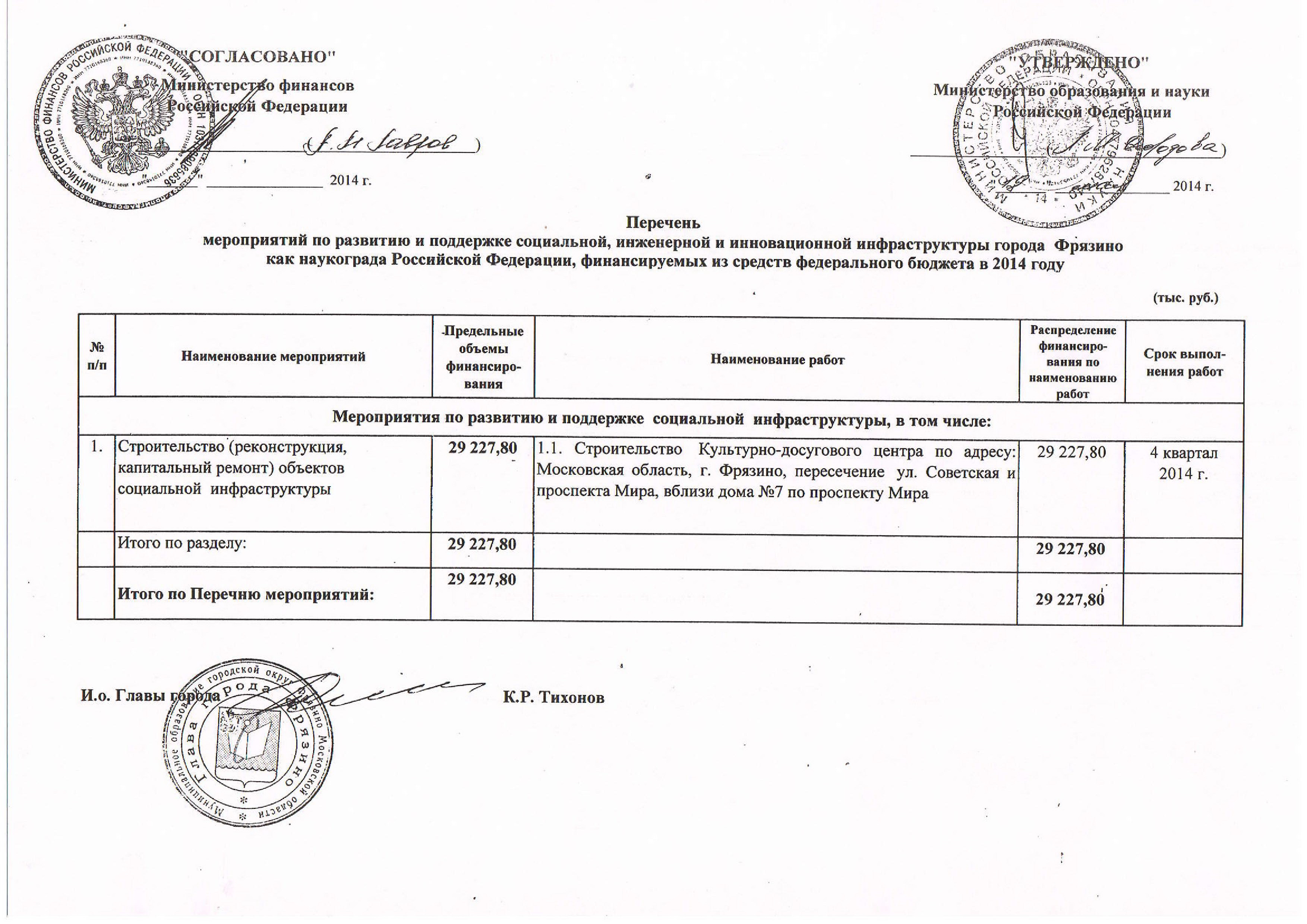 Перечень мероприятий по развитию и поддержке социальной, инженерной и инновационной инфраструктуры города Фрязино как наукограда Российской Федерации, финансируемых из средств федерального бюджета на 2014 год