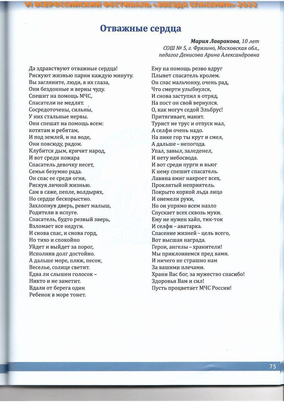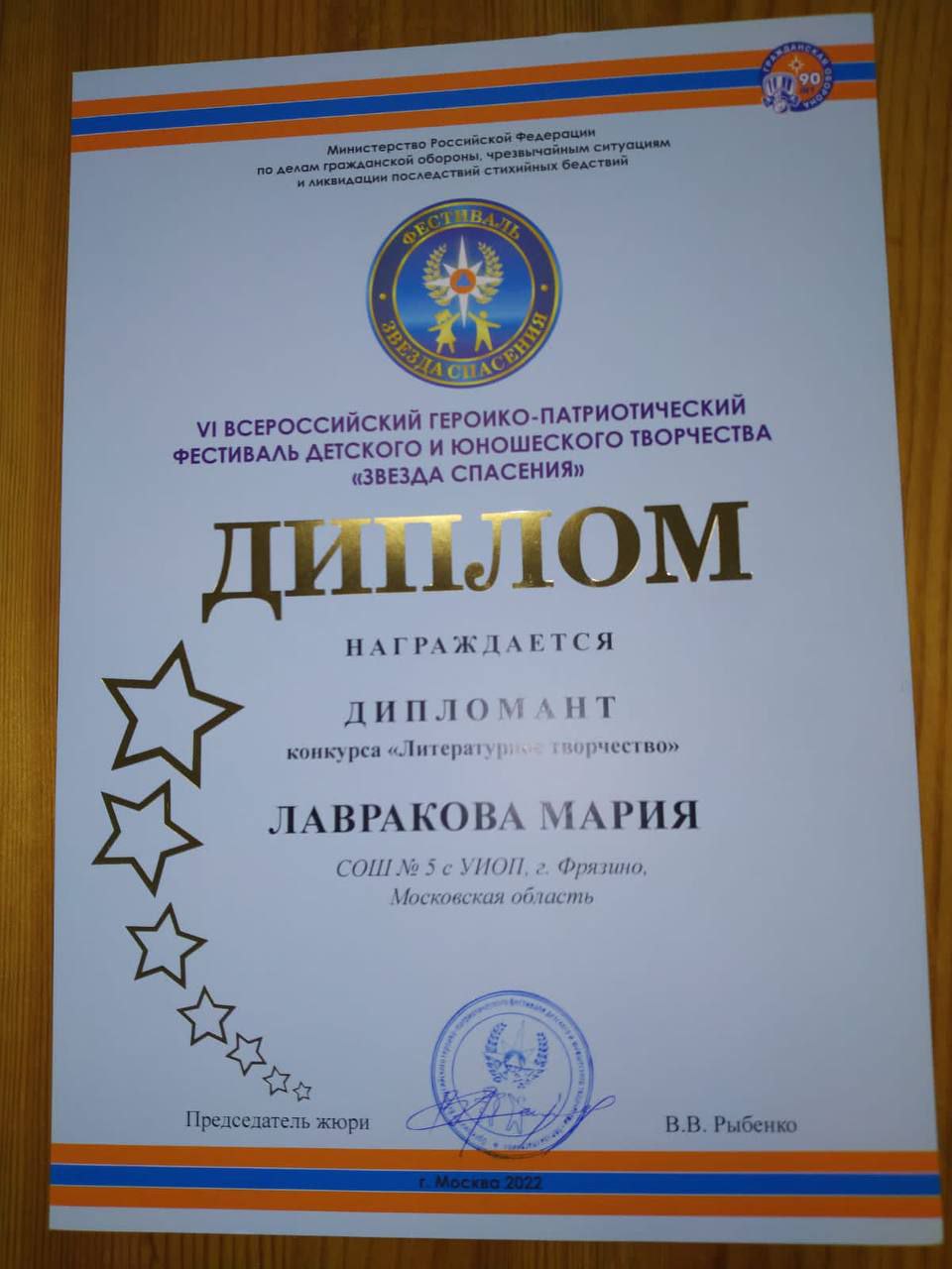 Ученица 5 «А» класса школы №5 Мария Лавракова стала дипломантом конкурса «Литературное творчество»Не перестану гордиться талантами наших учеников! Ученица 5 «А» класса МБОО СОШ №5 Мария Лавракова стала дипломантом конкурса «Литературное творчество» в рамках VI Всероссийского герой-патриотического фестиваля детского и юношеского творчества «Звезда спасения». Мария написала очень трогательное стихотворение о работниках МЧС России, их самоотверженности и тяжелых трудовых буднях. Ее творчество получило высокую оценку жюри, свою награду Мария получила из рук спасателей. В создании работы ей помогла учитель Денисова Арина Александровна. От всей души поздравляю Марию, ее родителей и конечно педагогов, которые раскрывают юные таланты, развивают кругозор и творческое мышление наших школьников. Глава городского округа Фрязино |
